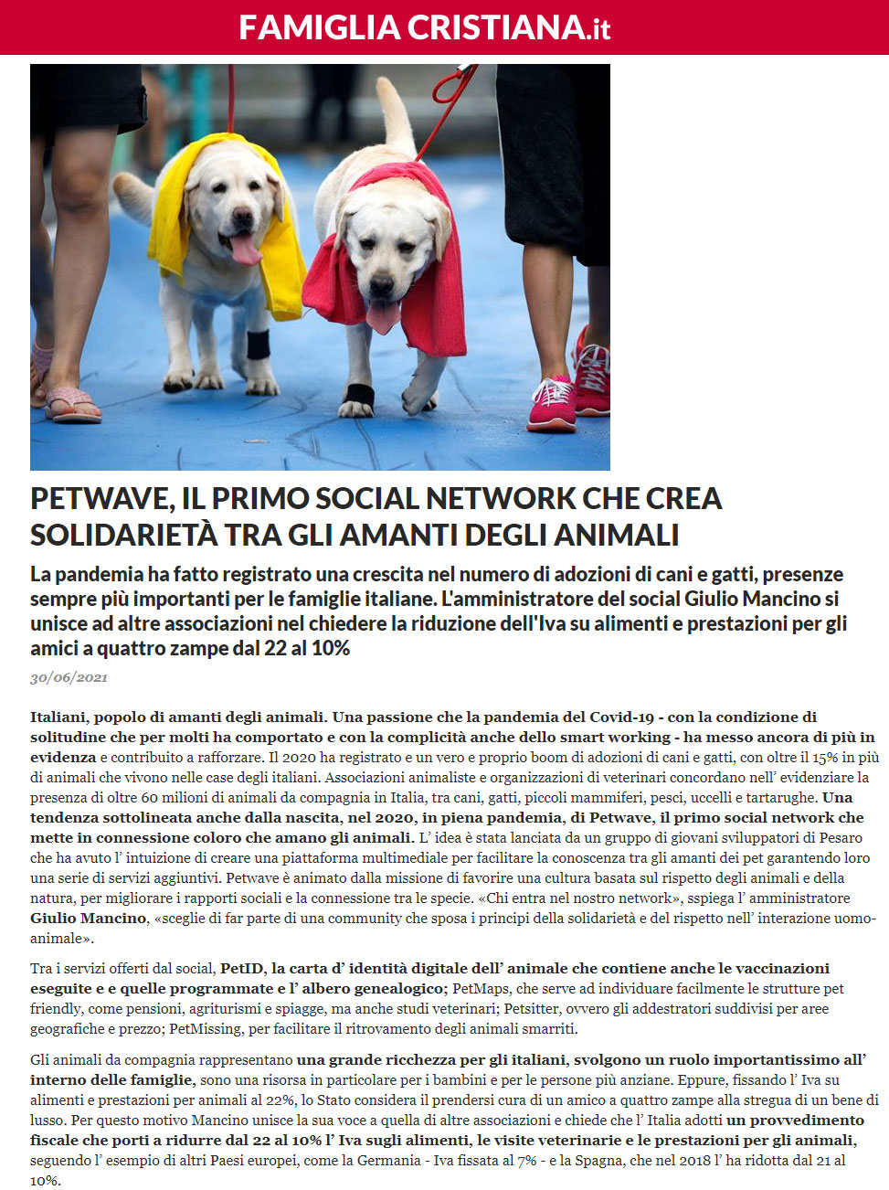 - Petizioni Petwave: abbiamo relizzato all'interno del primo Social Network per animali una campagna per la riduzione dell'IVA sui i prodotti dedicati gli animali così da rendere più equa la pressione fiscale per un bene fondalmentale dell'uomo